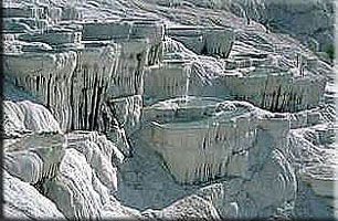 Uns allen wohl bekannt sind die Kalksinterterrassen von Pamukkale (Pamukkale heißt auf türkisch Baumwollburg oder Baumwollschlösschen, eine Bezeichnung die jene Landschaft im Umkreis des türkischen Denizli dem watte-weißen Aussehen ihrer Kalksinterterrassen verdankt) die zu den größten Naturwundern der Türkei zählen.